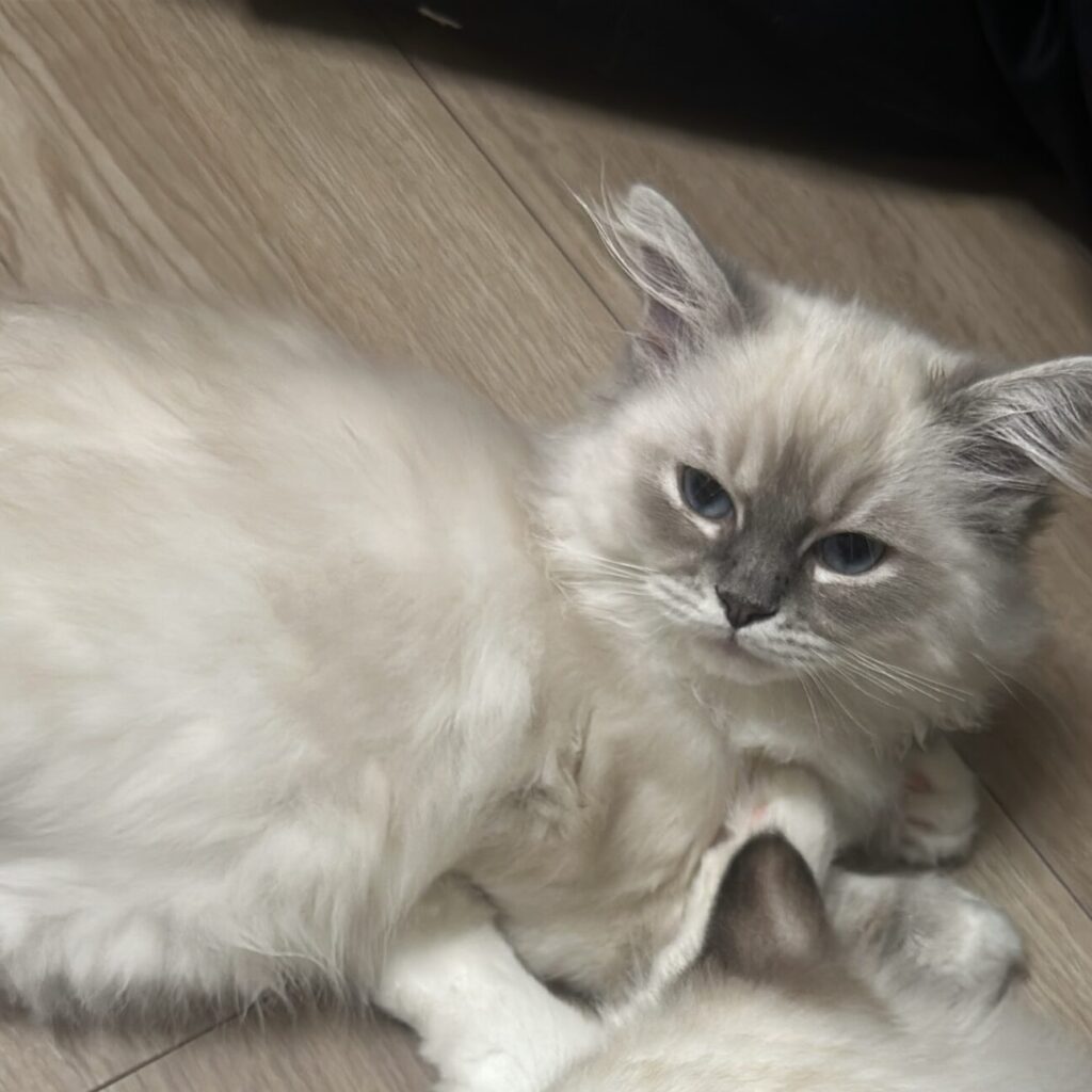 人懐っこく、甘えたさんだけど、知らない人にはビビってます。珍しく気を遣う猫で、人が通る所通る所、ひょいひょいと避けます。子猫が大好きで、男の子なのに面倒見が良いです。このプルくんの子供達の性格はプルくんに似た子が多いです。