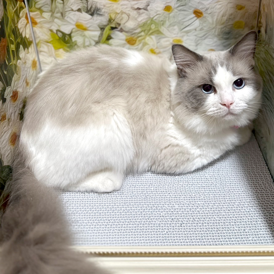 人懐っこく、甘えたさんだけど、知らない人にはビビってます。珍しく気を遣う猫で、人が通る所通る所、ひょいひょいと避けます。子猫が大好きで、男の子なのに面倒見が良いです。このプルくんの子供達の性格はプルくんに似た子が多いです。